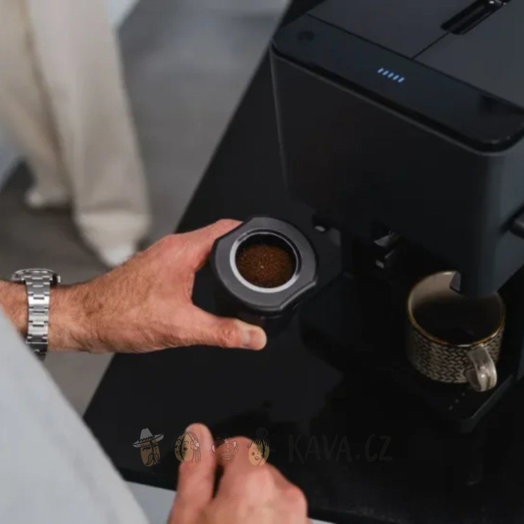 Zásobník na na zbytky mleté kávy není potřeba složitě vyndavat, vyklepávat do koše a vymývat. Stačí otočit spodní část ClickCupu, než uslyšíte charakteristický cvak, a pak mletou kávu jen vyšroubovat směrem nahoru. Puk je tak pevný, že ho prostě celý vezmete a hodíte do koše, aniž by vám cestou upadl jediný drobek.