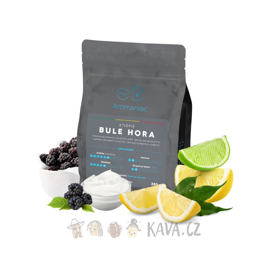 Etiopie Bule Hora pochází ze stejnojmenné mycí stanice v Guji v Etiopii. Svou úrodu sem nosí během období od října do února všichni malopěstitelé z okolí. Díky tomu, že se jejich plantáže nachází ve vysoké nadmořské výšce 1 900–2 100 m nad mořem a místní sopečné půdě, která je bohatá na živiny, má káva plné tělo, výraznější aciditu a je v ní hodně cítit ovoce (to je podpořeno i naturální zpracováním).