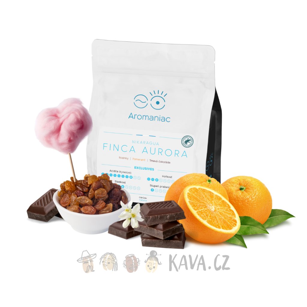 Představte si zimní pouť, je vám 5, všude svítí barevná světýlka, voní pomeranče a vy se cpete cukrovou vatou, rozinkami v medu a spoustou čokolády. To je Finca Aurora, slaďoučká Nikaragua plná chuťové nostalgie. Má jemné středně silné tělo a lehce hořkou dochuť. Skvělá výběrovka pro přípravu espresa na páce, v automatickém kávovaru i moka konvičce. A dobře si rozumí i s mlékem!