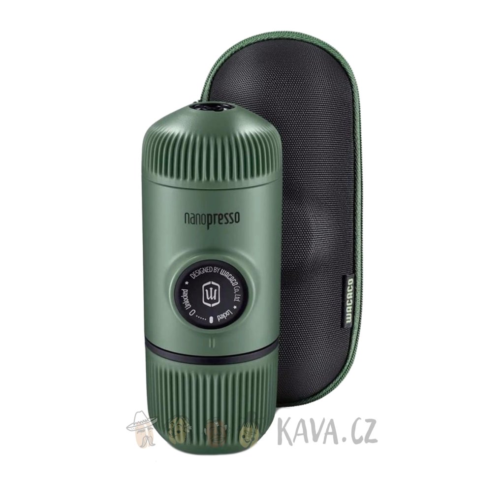 Cestovní kávovar v zelené barvě pro přípravu espresa bez použití elektrické energie včetně cestovního pevného pouzdra. Stačí horká voda v termosce a oblíbená káva.