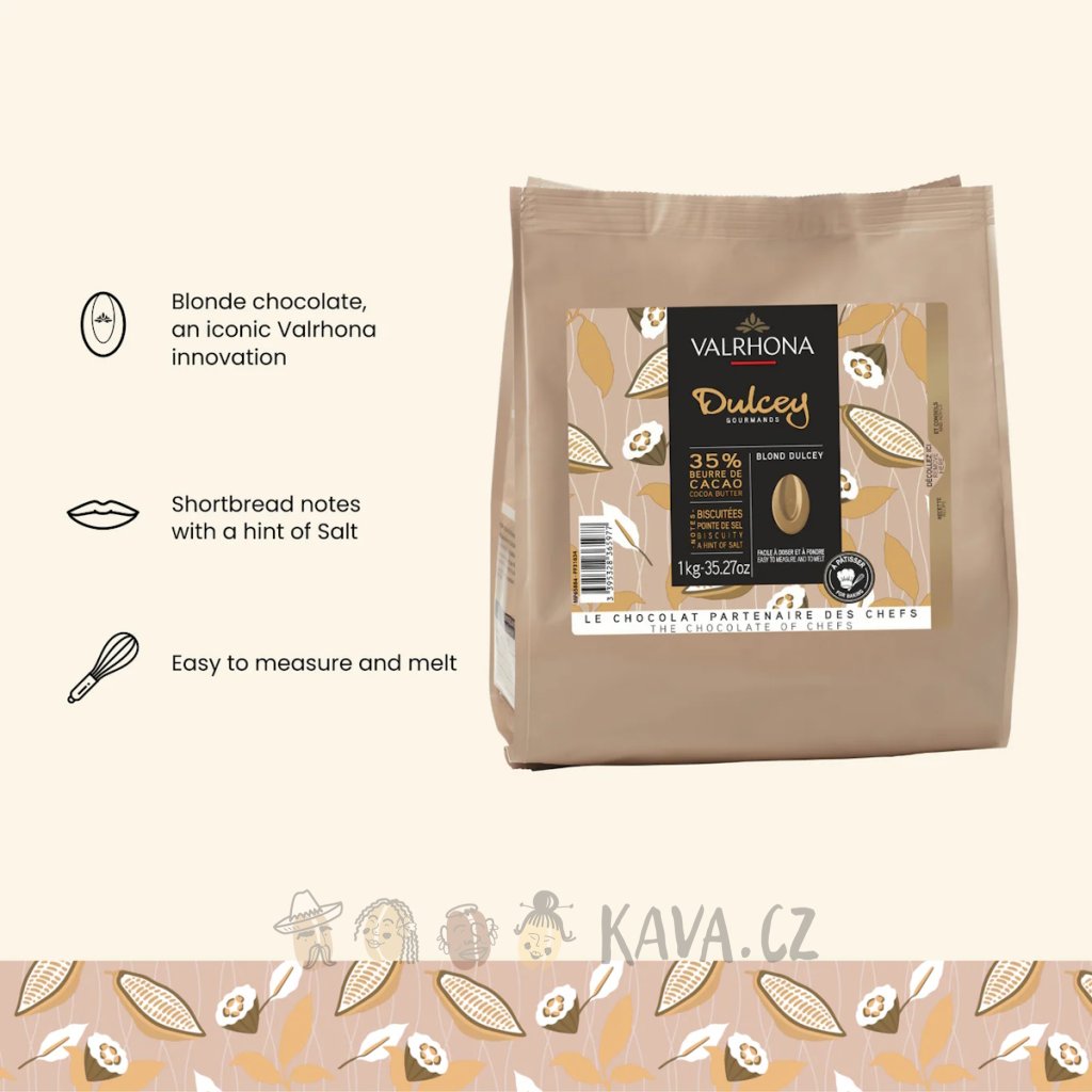 Je ideální pro přípravu krémů a ganache, ale lze ji použít také k potahování, formování, výrobě tyčinek, pěn nebo sorbetů. Její krémová chuť se perfektně hodí k ovoci, jako jsou meruňky, banány, mango nebo lískové ořechy. Díky svému ikonickému tvaru feve se tato čokoláda na pečení rychle rozpouští a snadno dávkuje, což je ideální pro přípravu gurmánských dezertů a snacků. Čokoláda Dulcey obsahuje 35 % kakaového másla, které jí dodává jemnost, lesk a jedinečné aroma. Tato čokoláda blond barvy se velmi dobře hodí k ovocným tónům: svůj plný potenciál odhalí v dezertu z manga, meruňky nebo banánu. A konečně, pro odvážnější, kteří hledají inovativní chutě, lze tuto čokoládu kombinovat se slanými pokrmy. Kousek sýra a trocha čokolády Dulcey potěší vaše chuťové buňky překvapivým a lahodným výsledkem.