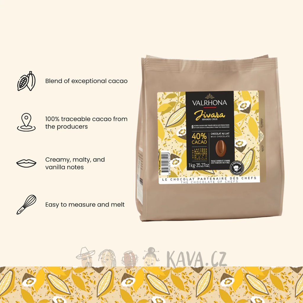Intenzivní kakaová chuť čokolády VALRHONA Lait Jivara změnila pravidla výroby čokolády. Tato aromatická mléčná čokoláda, skutečná hvězda cukrářství, inspirovala mnoho gurmánských receptů. Mléčná čokoláda Valrhona Jivara obsahuje 40 % kakaa, což jí dodává dokonalou rovnováhu mezi sladkostí a intenzitou. Díky vysokému obsahu kvalitního mléka se čokoláda Jivara lahodně rozpouští v ústech a nabízí hladký a sametový zážitek.