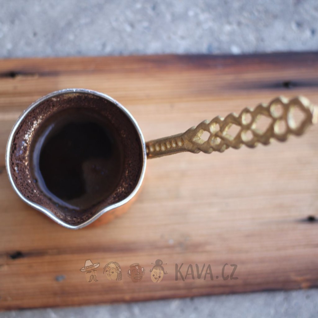 Stylová džezva vyrobená v Turecku je měděná, uvnitř pocínovaná.