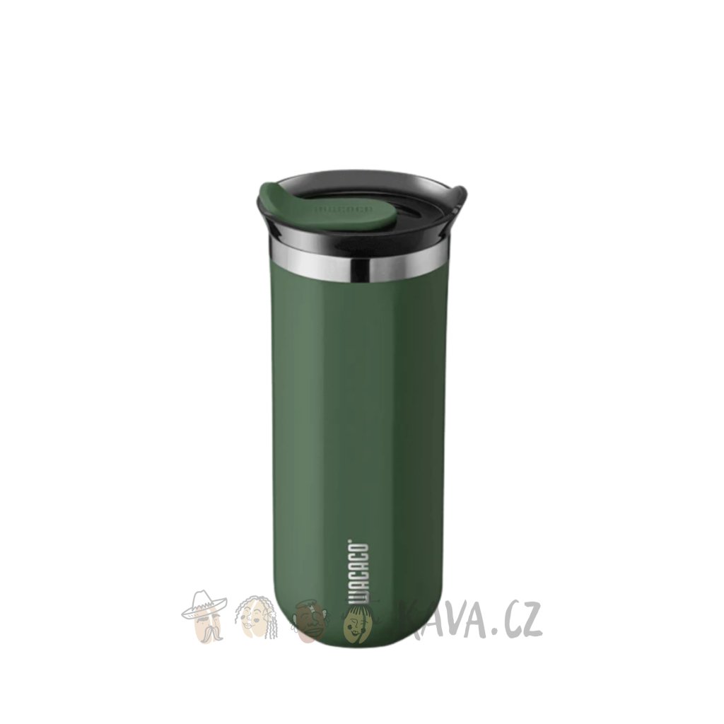 Odolný cestovní termohrnek Wacaco. Tmavě zelený z nerez oceli, s vakuovou izolací a šroubovacím úzávěrem. Objem 300 ml.