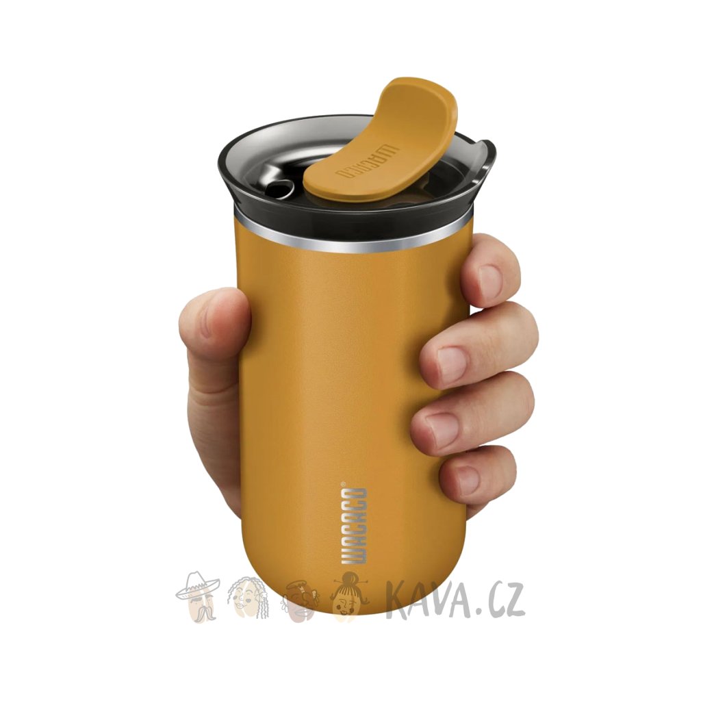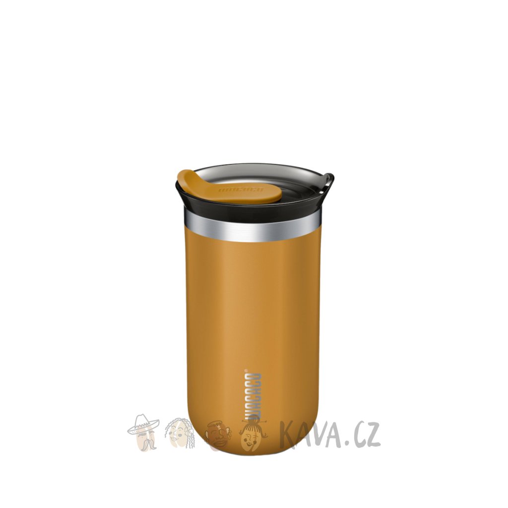 Odolný cestovní termohrnek Wacaco. Sytě žlutý z nerez oceli, s vakuovou izolací a šroubovacím úzávěrem. Objem 300 ml.